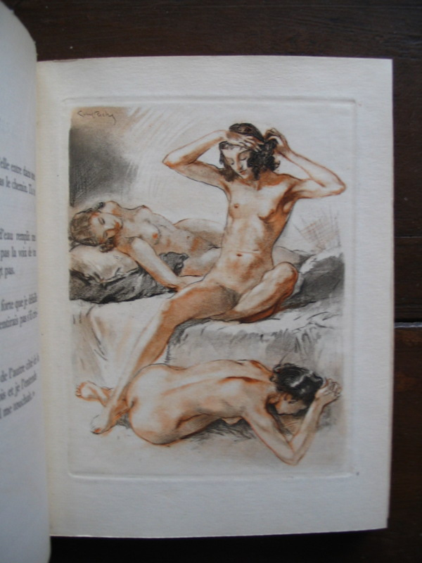 Les Dialogues des courtisanes du philosophe Lucien de Samosate. Ce dernier, écrivain de langue grecque, vécut sous les Antonins (v. 120 - ap. 180) et quitta la Syrie pour étudier auprès de Démonax, à Athènes. Il s’inscrit dans la lignée des héritiers d’Aristophane, Platon et Ménippe. Ses dialogues (Dialogues des morts, Dialogues des dieux, Dialogues marins et Dialogues des courtisanes) sont des pièces satiriques, où l’humour l’emporte sur l’intention moralisatrise qui vise à dénoncer les vices humains, en premier lieu le mensonge et l’hypocrisie. Cette édition d’une traduction nouvelle de l’éditeur, au tirage strictement limité et justifié, est illustrée de 10 compositions à caractère légèrement érotique d’Édouard Chimot (principalement des nus féminins), reproduites en hors-texte et coloriées au pochoir dans les ateliers d’Edmond Vairel, enlumineur d’art à Paris. Elle a fait l’objet d’une reliure soignée de l’époque.