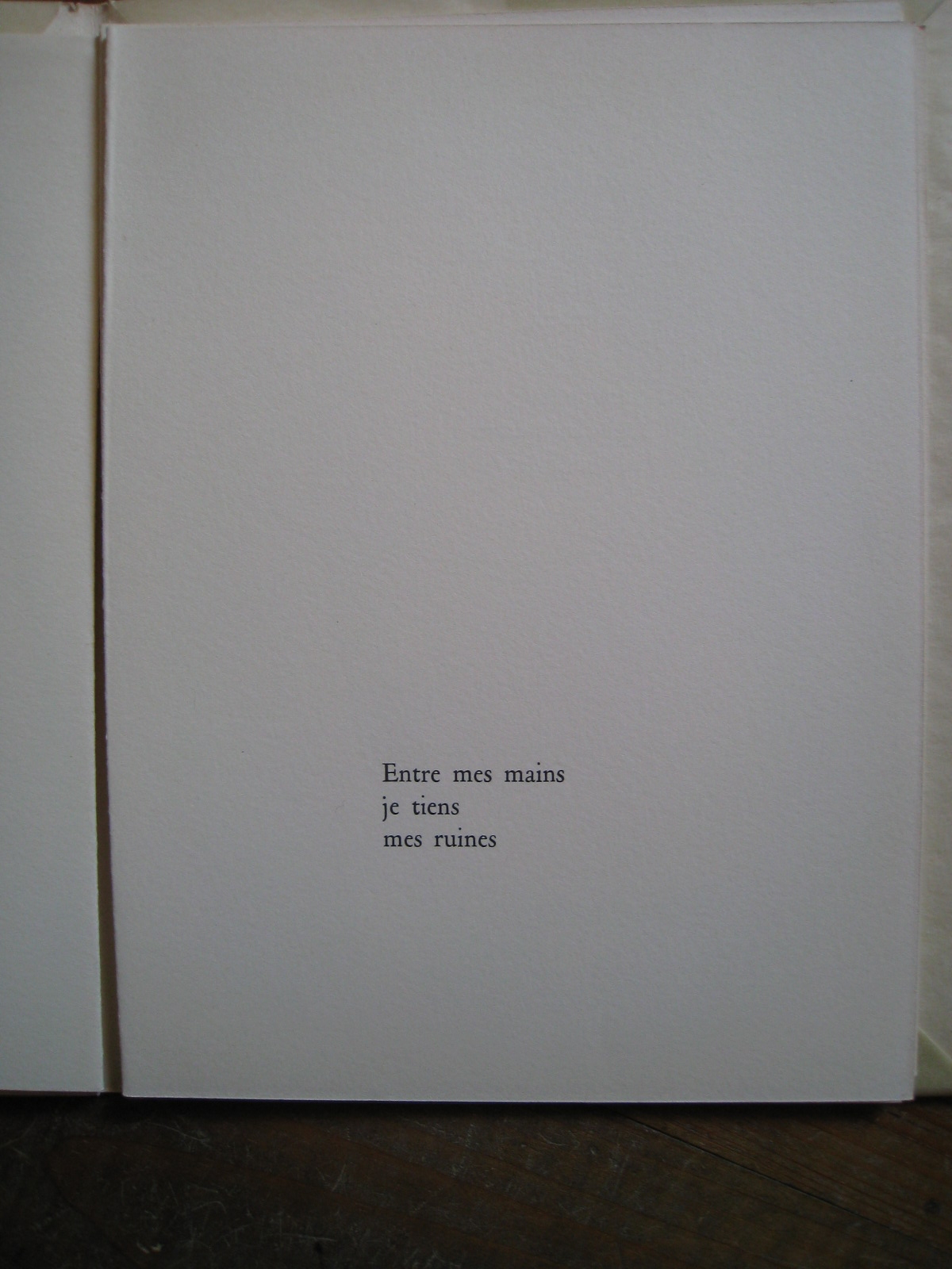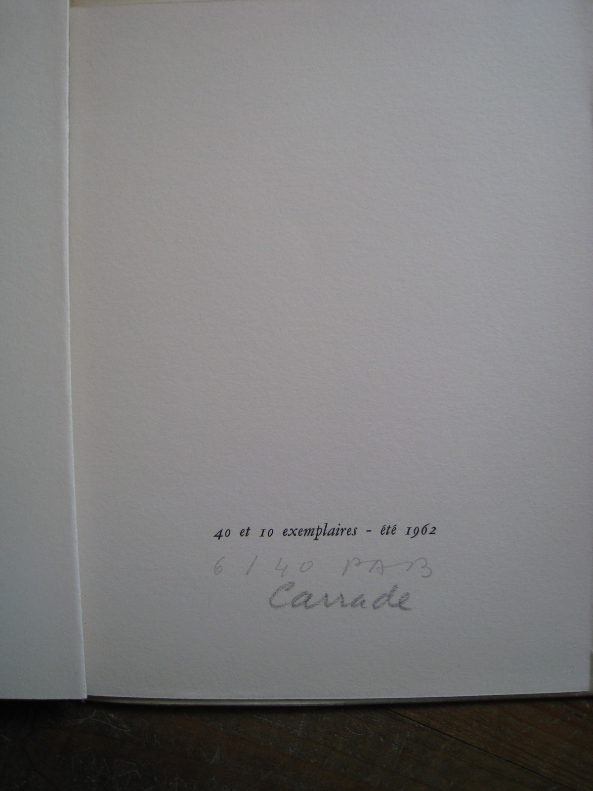 Édition originale numérotée 1/40 exemplaires sur vélin, justifié à la main et signé par l'auteur et l'artiste à la justification [tirage total 50 exemplaires]. Format in-8°, non paginé, en feuilles, sous couverture imprimée rempliée. Illustré de 4 gravures originales hors texte de Michel Carrade. Bel exemplaire.