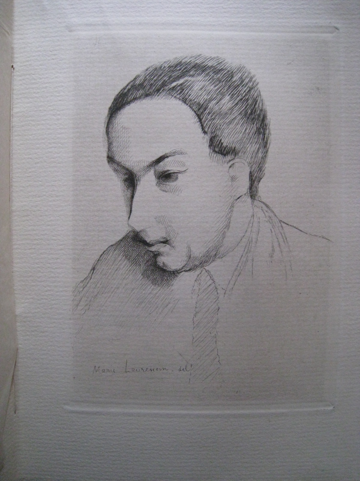 Édition originale. L'un des 1000 ex. sur Vergé de Rives B F.K. pur chiffon. Format in-octavo (145x190). 82p. Couverture beige, rempliée, titre en rouge. Le volume contient en frontispice un portrait de l'auteur signé de Marie Laurencin gravé par Gorvel. Les bois de Roger Grillon comprennent 3 bandeaux, culs-de-lampe et planches. De la Collection "Les Panathénées", n° XI. Typographie soignée : titre repris dans les en-têtes à l'encre rouge. Couverture salie avec une pâle mouillure et une trace de colle affectant le premier plat, sinon bel exemplaire, très frais.