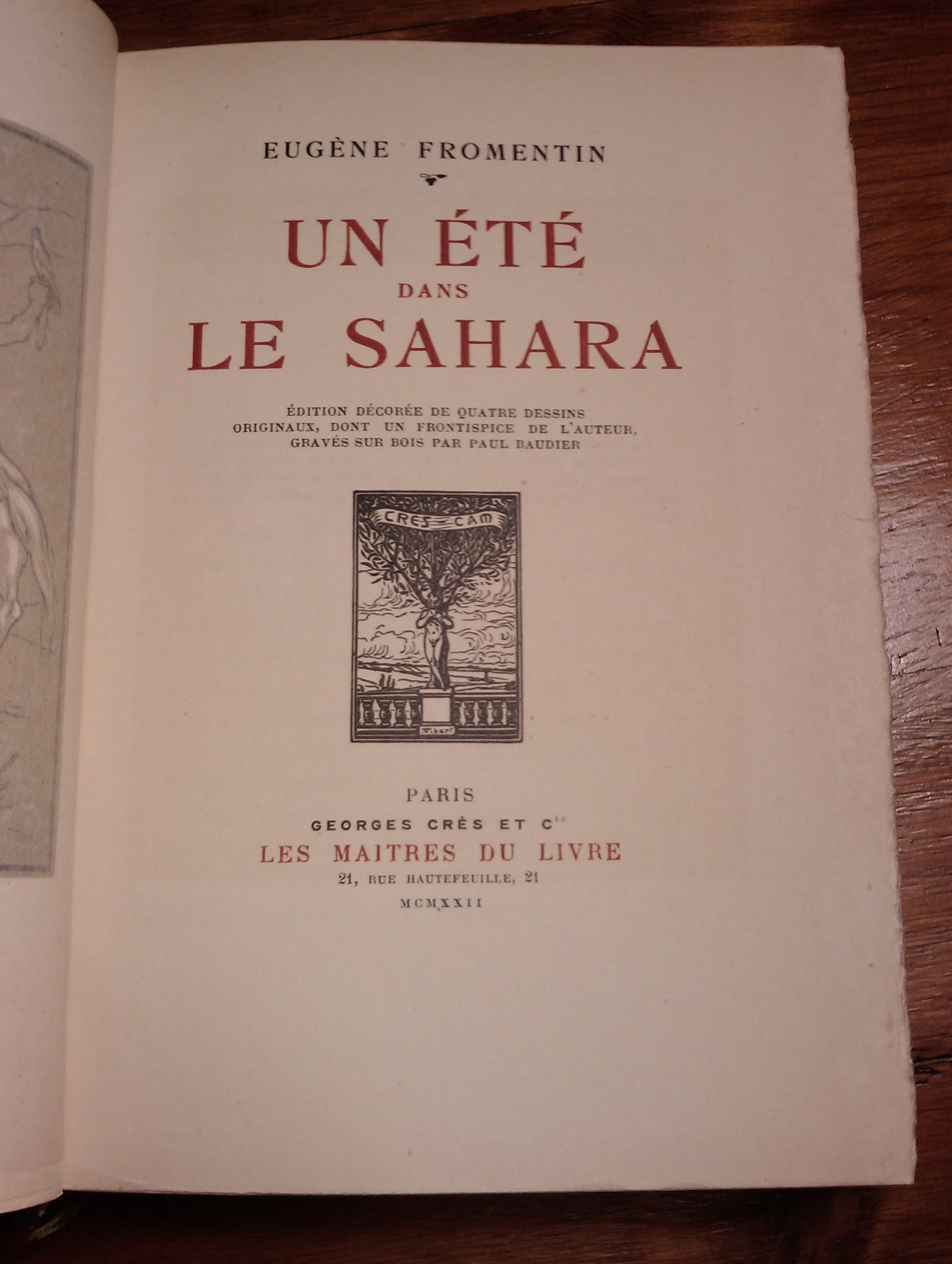 Le récit orientaliste d'Eugène Fromentin, écrit d'après ses souvenirs d'Algérie, est ici accompagné de bois dessinés et gravés par Paul Baudier, dont un bicolore en frontispice. Cet ouvrage fait partie de la collection « Les Maîtres du Livre », chez G. Crès et Cie. Tirage strictement limité et justifié.