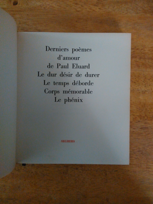 Les Derniers poèmes d’amour de Paul Éluard, aux éditions Seghers (Paris, 1965) regroupe : Le dur désir de durer, Le temps déborde, Corps mémorable, et Le phénix. Les quatre recueils sont illustrés de dessins et de portraits par Chagall, Picasso et Valentine Hugo ; des poèmes et des lettres de Paul Éluard sont reproduits en couleurs en fac-similé, ainsi qu’un album au souvenir de Nusch, photographiée par Man Ray, Dora Maar, Rose Adler, etc. Préface de Lucien Scheler : cet éditeur, libraire, écrivain et poète participa à la Résistance littéraire pendant la guerre.