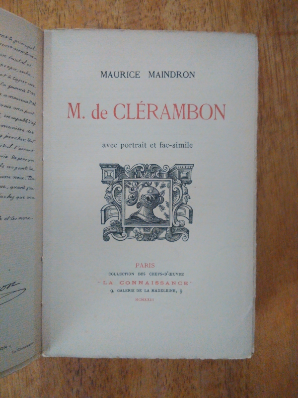 M. de Clérambon : ce récit de fiction historique de Maurice Maindron, publié pour la première fois en 1904 chez Eugène Fasquelle, est l’objet du 28