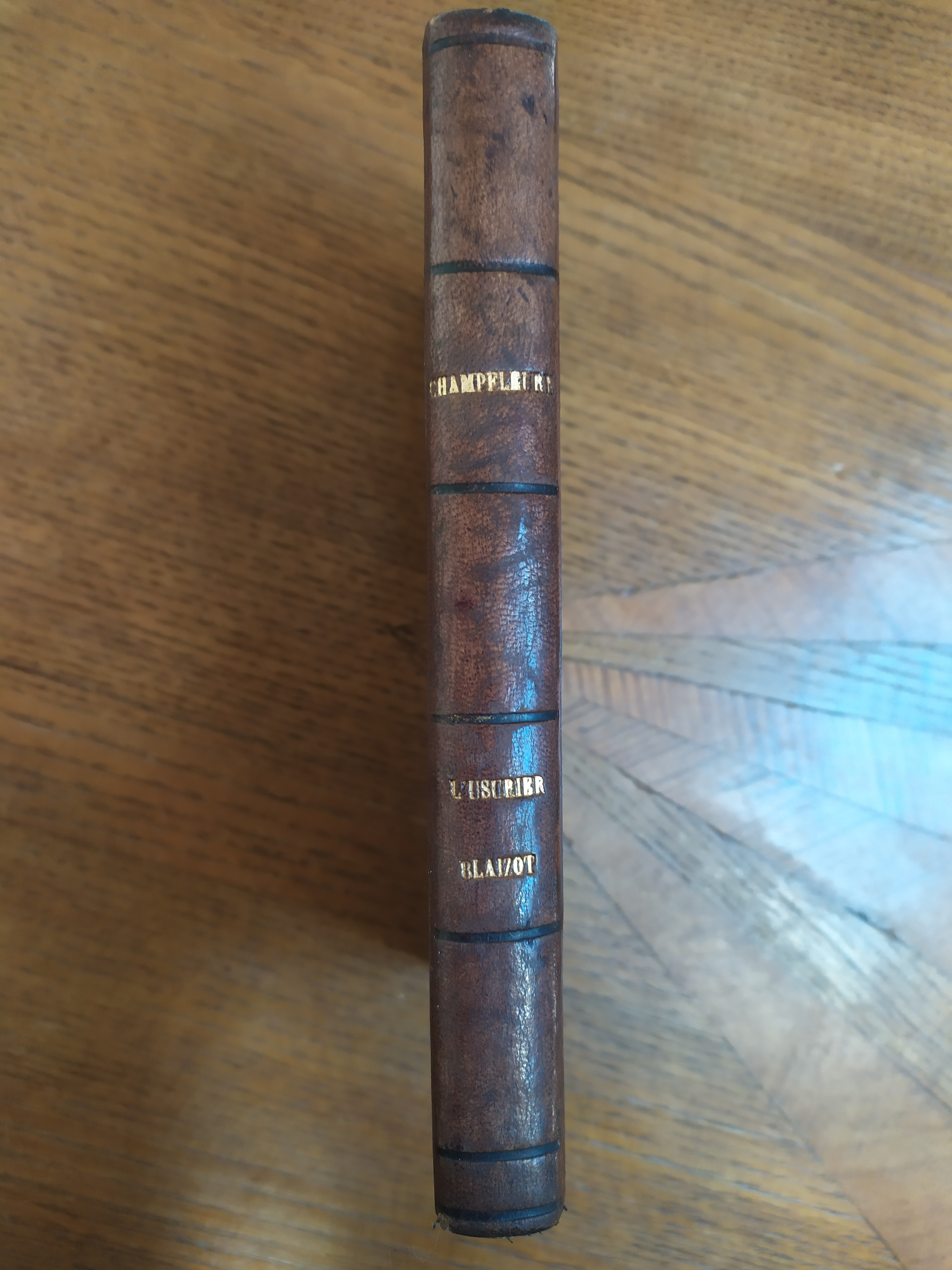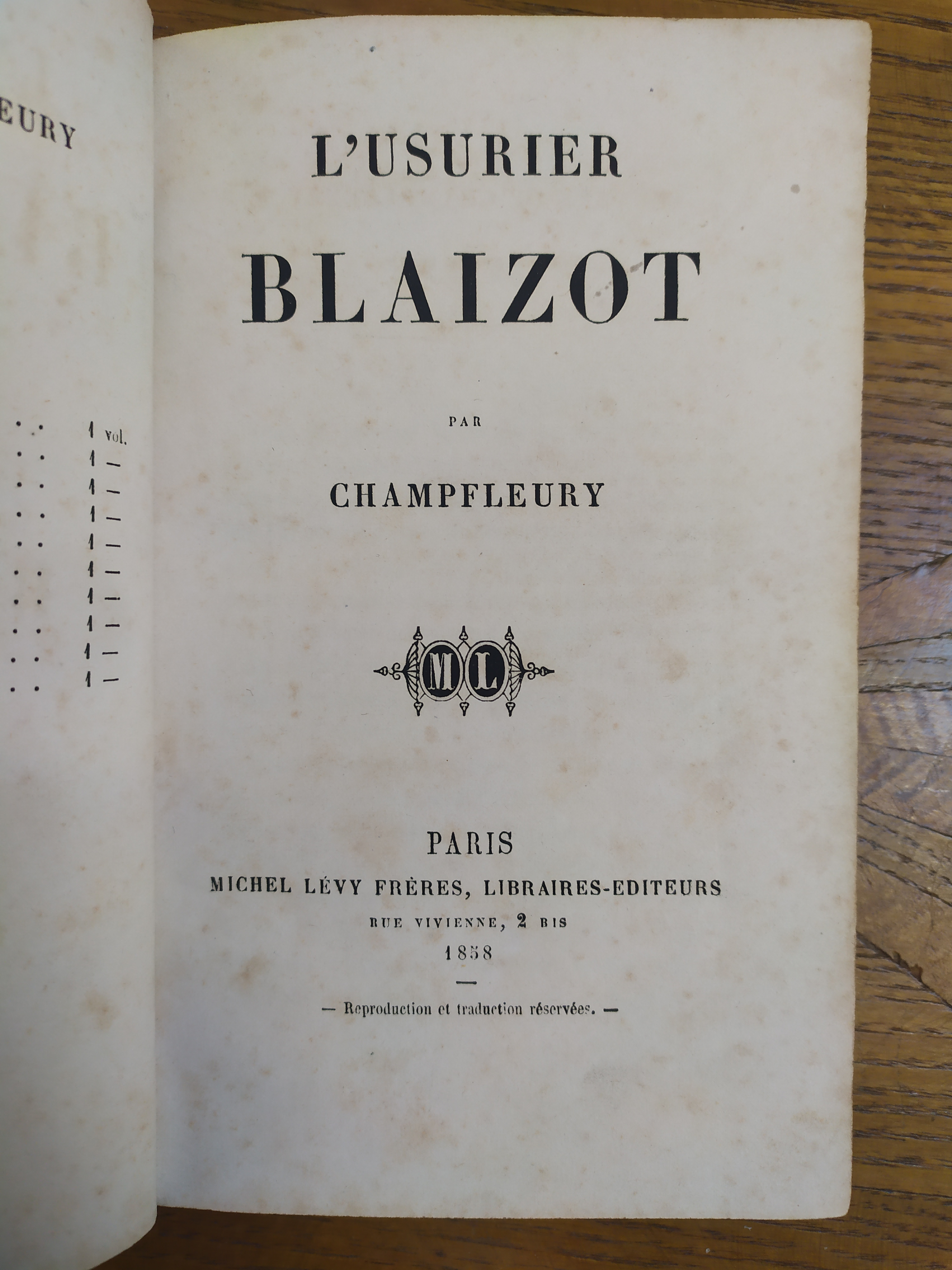 Jules François Félix Husson, dit Fleury, dit Champfleury, est un écrivain français né à Laon le 10 septembre 1821 et mort à Sèvres le 6 décembre 1889. Journaliste, critique d’art, dramaturge, nouvelliste et romancier, il se lie d’amitié avec Victor Hugo et Gustave Flaubert, tout en s’attirant l’hostilité des frères Goncourt, dont il stigmatise le « maniérisme ». Soucieux de se venger de ses attaques, les frères Goncourt lui reprochent alors une orthographe approximative et un « manque de style ». Ils iront jusqu’à le caricaturer dans leur roman Charles Demailly, consacré aux milieux intellectuels de leur temps. Les romans et nouvelles de Champfleury s’attachent à la description réaliste de la petite bourgeoisie et de la bohème, ce qui est le cas pour cet Usurier Blaizot, qui est en fait une réédition sous un nouveau titre du texte remanié Les Oies de Noël, de 1852.
