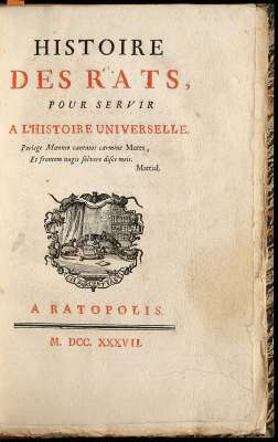 Une satire qui fait du destin des rats le pendant de l’Histoire des Hommes. Texte écrit (en partie) en réponse à l’ Histoire des Chats, de François-Augustin Paradis de Moncrif : en 1727, ce dernier ouvrage inattendu remporta un franc succès, qui permit à son auteur d’être reçu à l’Académie française en 1733 [réédité à La Part Commune en 1999 ; ISBN 2-84418-005-1]. Le texte anonyme de l’ Histoire des rats a longtemps été attribué à Voltaire. Cette édition comprend trois gravures très curieuses : une en frontispice, représentant une dame de la cour en costume d’où sortent des rongeurs, accompagnée d’un nain en costume bizarre et d’un homme barbu, une vignette de titre représentant des rats entrain de lire, et une planche insérée entre les p. 84-85 qui représente une statue de l’ Apollonis Smyntheus (aspect d’Apollon grec), c’est-à-dire littéralement « le tueur de rats », qui était invoqué pour repousser la peste. Bien que guérisseur, le dieu pouvait néanmoins se montrer terrible : Sophocle, dans son Œdipe, lui fait abandonner une cité livrée à la maladie, par vengeance envers les habitants de celle-ci. [Réf. BARBIER, 764 ; GAY II,546]. Si l’on en croit l’exemplaire disponible chez un libraire d’Amsterdam, une réédition, tout aussi rare sinon plus, en aurait été faite en 1738, avec une nouvelle page de titre (à nouveau, « à Ratopolis ») et un nouveau « discours préliminaire ».