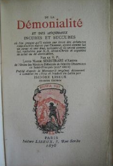 SINISTRARI, Ludovico Maria d’Ameno. De la Démonialité et des animaux incubes et succubes : où l’on prouve qu’il existe sur terre des créatures raisonnables autres que l’homme ayant comme lui un corps et une âme, naissant et mourant comme lui, rachetées par N.S. Jésus-Christ et capables de salut ou de damnation. Par le R.P. Louis-Marie Sinistrari d’Ameno,… ; publié d’après le manuscrit original découvert à Londres en 1872 et traduit du latin par Isidore Liseux. Deuxième édition. Paris, I. Liseux, 1876.
