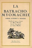 La Batrachomyomachie. Poème attribué à Homère. Translaté du grec en français par Mario Meunier, orné de bois gravés par Lucien Boucher. Paris, Chez Marcel Seheur, n. d. [1920]. Dans ce poème grec héroïco-comique, rédigé en vers entre le VIe et le IVe siècle avant notre ère, grenouilles et rats s’opposent dans une lutte à mort, sorte d’Illiade burlesque, pour le plus grand souci des dieux de l’Olympe, jusqu’à ce que ces derniers se sentent obligés d’intervenir dans les affaires des rongeurs & batraciens. L’édition qui en a été faite chez Marcel Seheur est limitée à 525 exemplaires. Elle comporte onze bois gravés en hors-texte, dont un en frontispice, et 22 bois gravés in-texte, plus les culs-de-lampe, têtes de chapitre et lettres ornées, l’ensemble ayant également été mis en couleurs par Lucien Boucher.