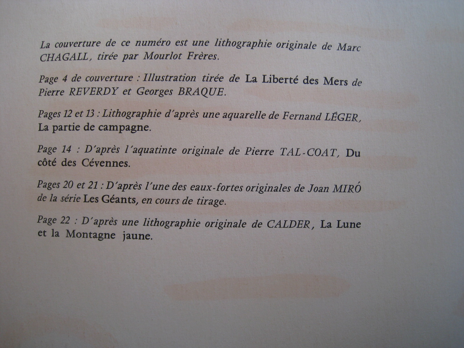 ÉDITIONS MAEGHT 1960 - Queneau. Paris, Maeght, décembre 1960-janvier 1961, in-folio, 38 x 28 (H x L). 1 lithographie en couleurs de : CHAGALL. 1 lithographie originale en noir de : FIEDLER. Lithographies d'après BRAQUE, CALDER, LEGER, MIRO et TAL-COAT. Textes de Jean Adhémar "A propos de la gravure originale" et de Raymond Queneau "Les deux bouts du pinceau", poèmes de Jacques Prévert "Etre ange" et "Le défilé", de Jean Tardieu "Pétales perdus par l'oiseau marin" et d'André du Bouchet. Dos et bords jaunis, petits manques en tête et en queue, deuxième plat frotté et taché, sinon bel exemplaire du tirage original de cette revue mythique.