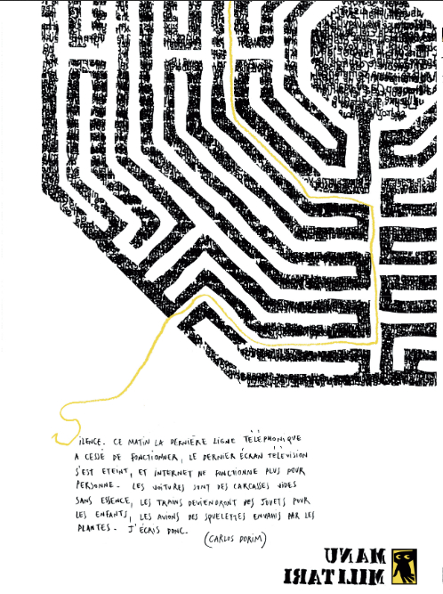 - Silence. Ce matin la dernière ligne téléphonique a cessé de fonctionner, le dernier écran télévision s’est éteint, et Internet ne fonctionne plus pour personne. Les voitures sont des carcasses vides sans essence, les trains deviennent des jouets pour les enfants, les avions sont des squelettes envahis par les plantes. J’écris donc. (Carlos Dorim)