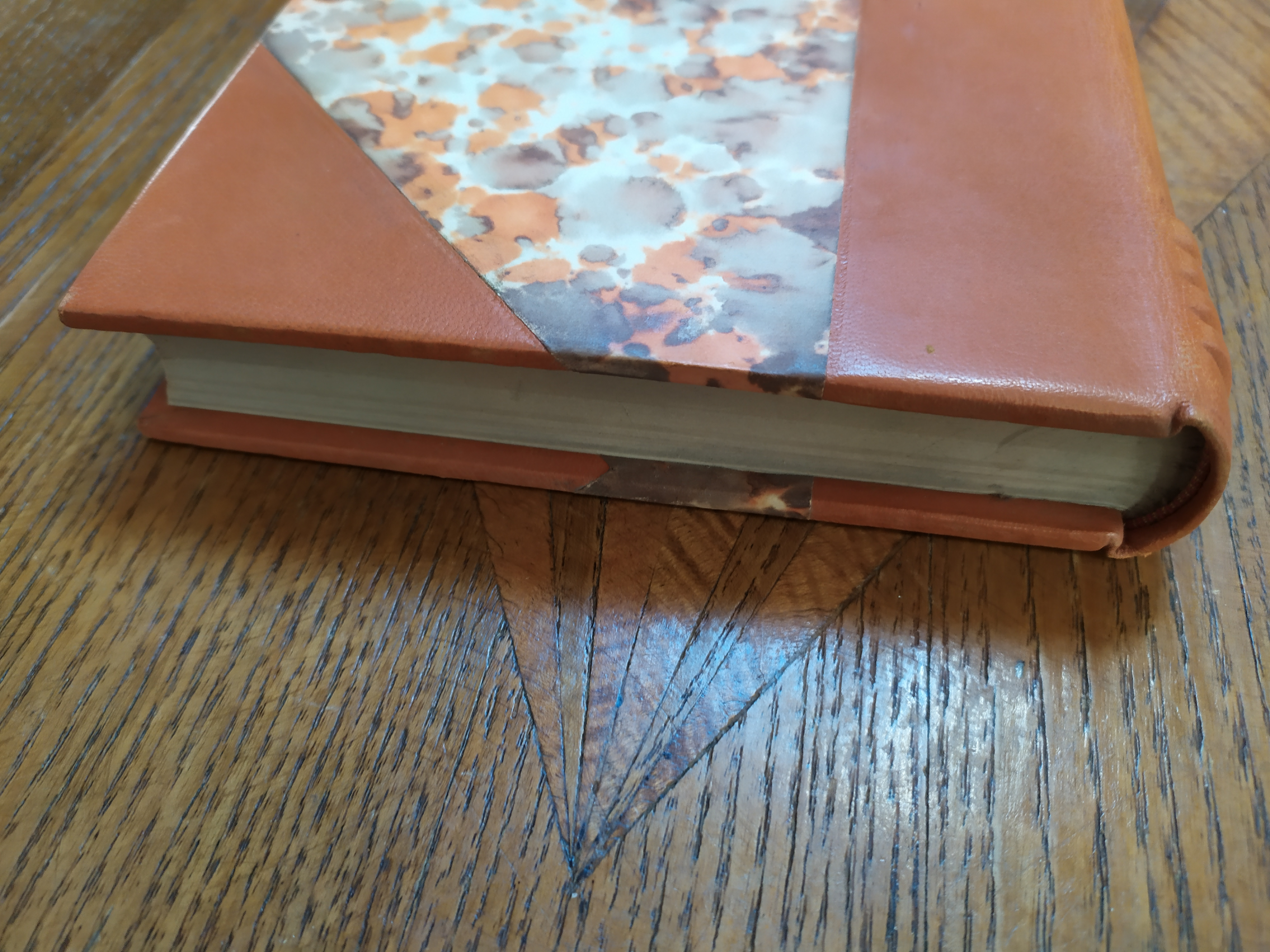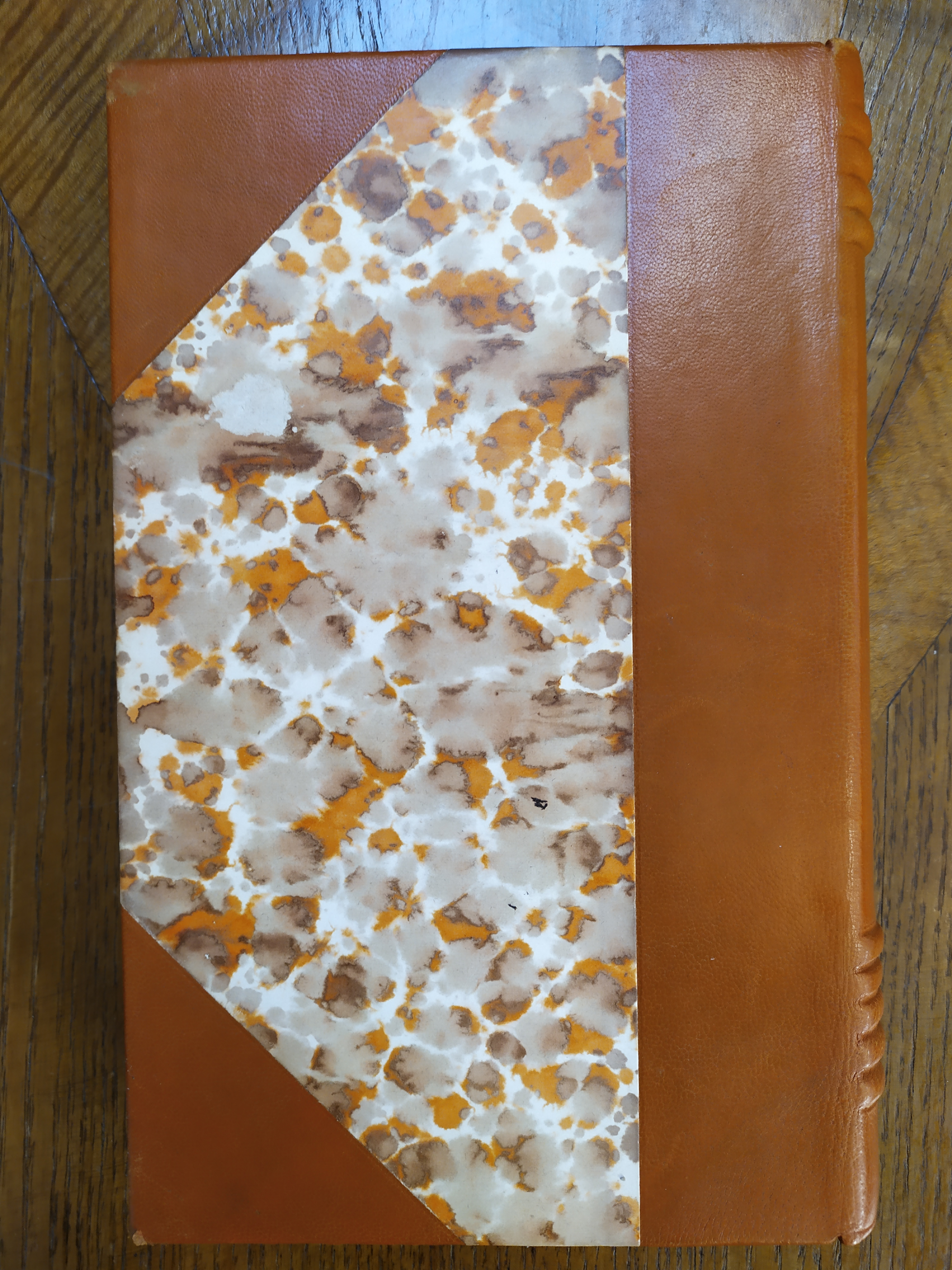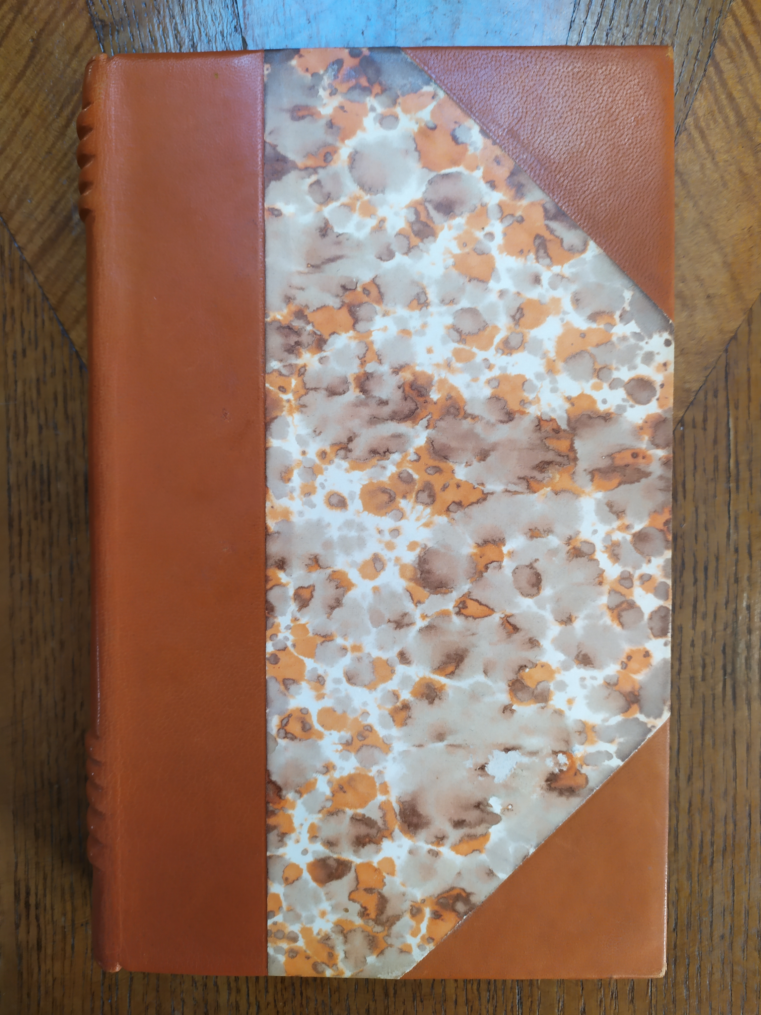 Un volume in-8 dans une reliure à la Bradel en basane fauve. Dos lisse orné du titre et du nom de l'auteur dorés. Plats et gardes jaspés. Couverture d'origine conservée (plats). Toutes tranches lisses. 259 pages. Papier légèrement passé, quelques pâles rousseurs en début d'ouvrage. Un des exemplaires du tirage strictement limité et justifié, celui-ci un des 1500 sur vélin bouffant des papeteries de Papault, ceux sur Japon et sur Vélin d'Arches.