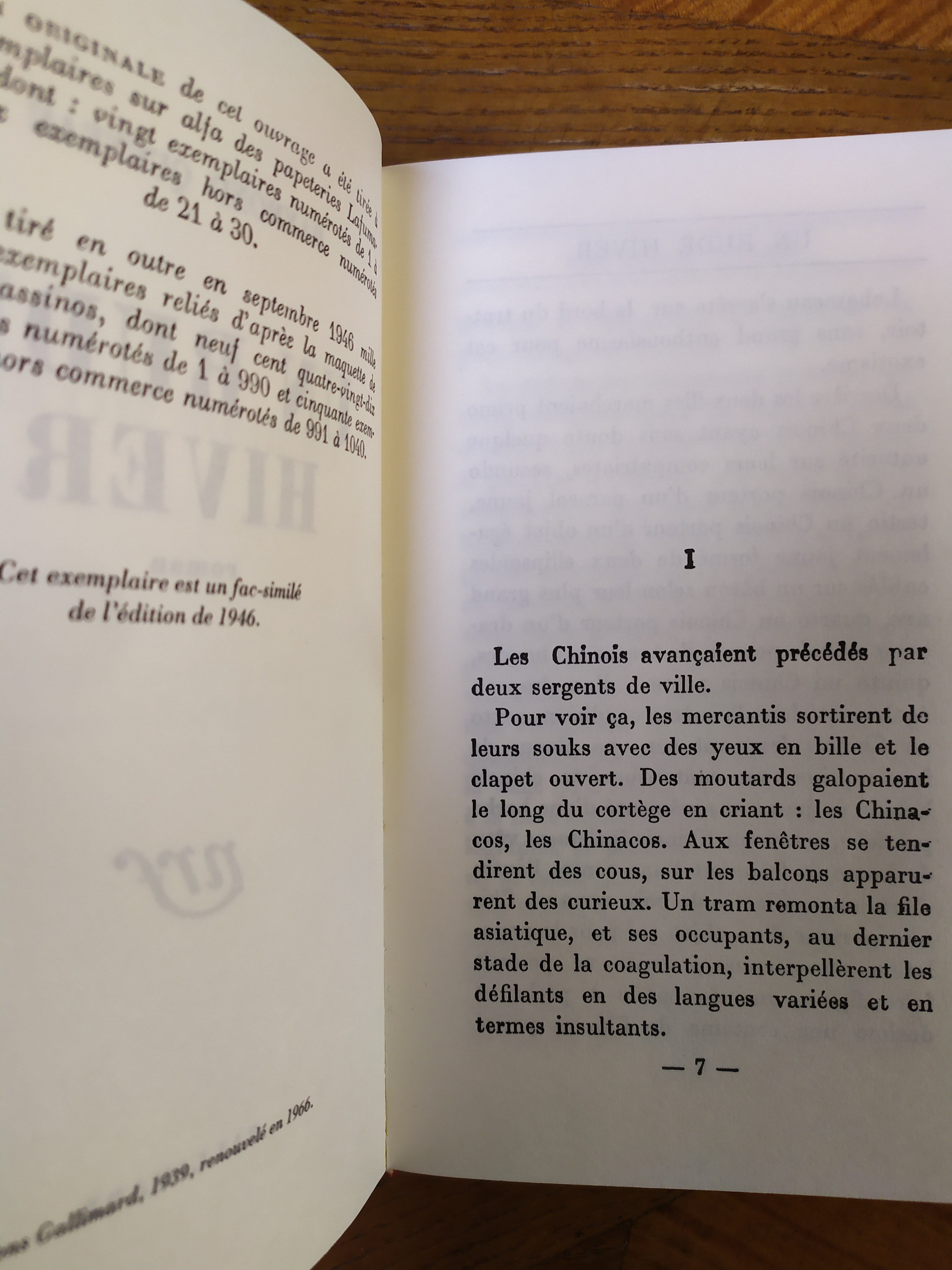 Un volume in-8 dans un cartonnage de l'éditeur de couleur noire orné d'un décor réalisé d'après la maquette originale datée de 1946 de Mario Prassinos. Gardes ornées du logotype de la N.r.f. 221 p.