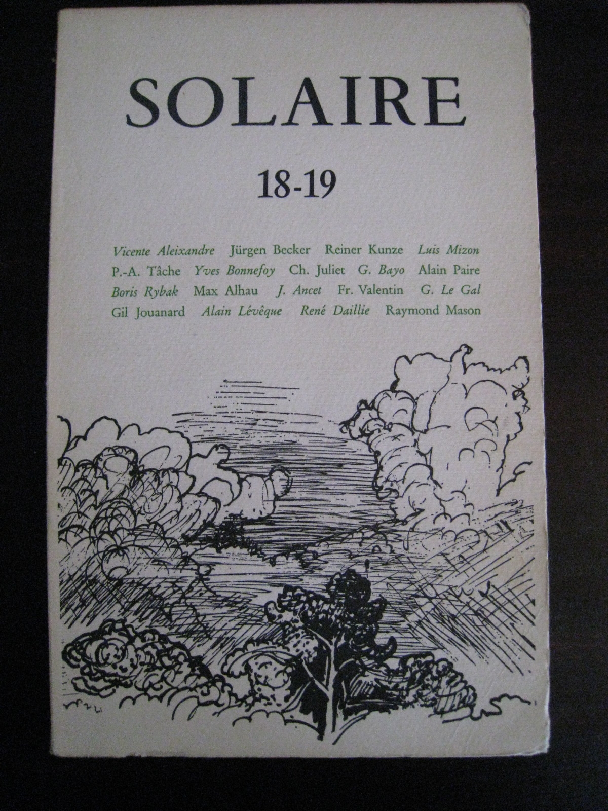 Vicente Aleixandre, prix Nobel (trad. Jacques Ancet), Jürgen Becker (trad. R. Daillie, ainsi que) Reiner Kunze. Luis Mizon Morales (trad. Benito Pelegrin), Yves Bonnefoy (A propos de Yeats et de Bram Van Velde), Charles Juliet (Trois rencontres avec Bram Van Velde), Gérard Bayo, Alain Paire, Boris Rybak, Max Alhau, Jacques Ancet, François Valentin, Gabriel Le Gal, Gil Jouanard, Alain Lévêque, René Daillie, Yves Bonnefoy. Raymond Mason (dessins).