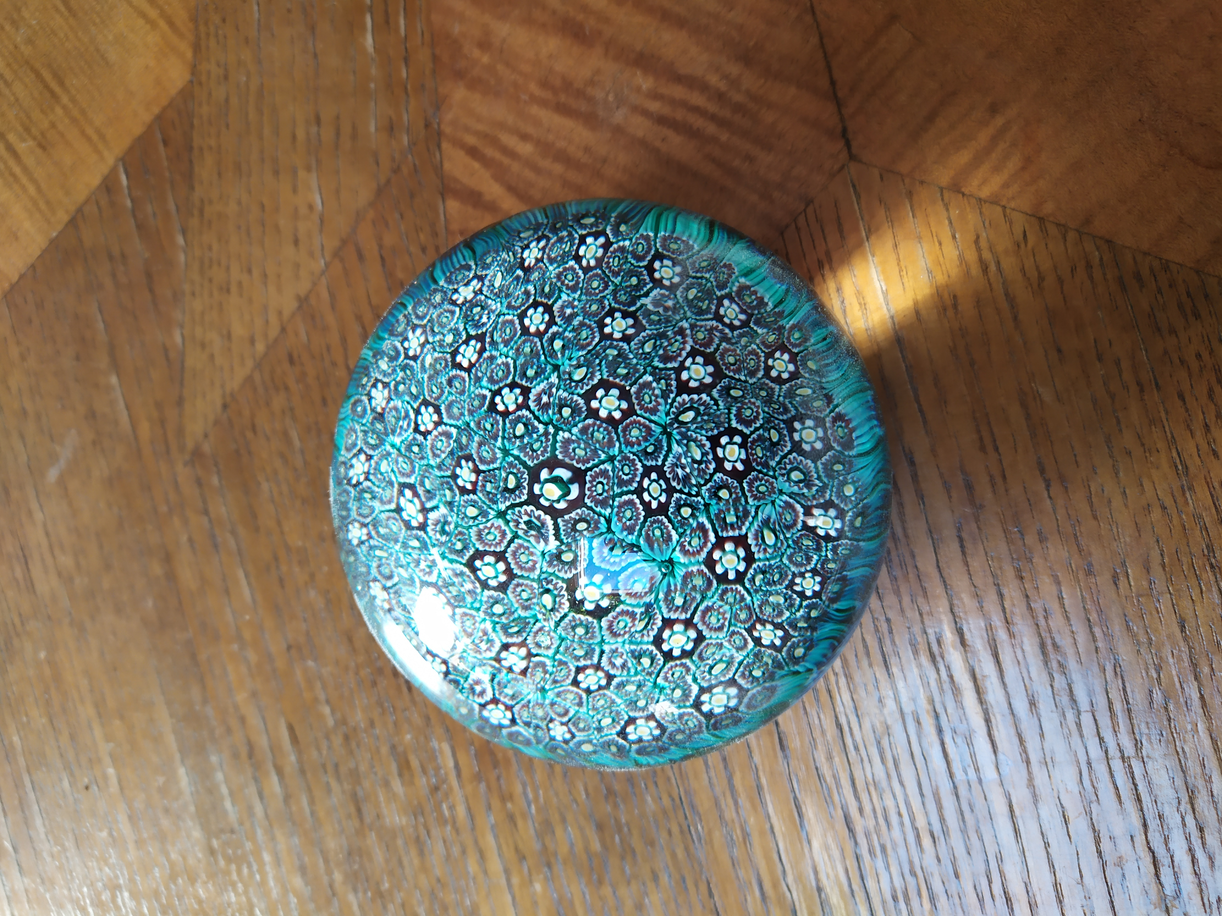 Grand sulfur ancien Millefiori de Murano (vingtième siècle). Tons bleus dominants, et forme aplatie. Idéal pour servir de presse-papiers.